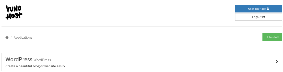 On the main Applications page, you'll find a list of applications approved and provided by YunoHost. To install any of them, click the "Install" option at the bottom right corner of the desired application. Use the search field at the top of the table to quickly find the application you want.
